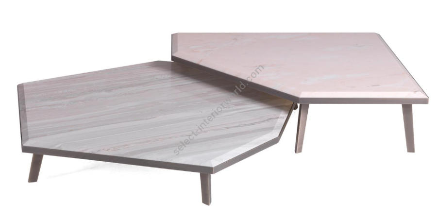 Refined set of coffee tables with marble top composed of a low table cm. 120 x 110 x h.17.5 and a high table cm. 100 x 90 x h.26. Also available in the eucalyptus wood version. The elegance of their design and materials makes the EXPANDING coffee table set a functional and elegant product. Their apparent simplicity hides their great design complexity. The EXPANDING coffee table set was designed to complete the modular seating set of the same name.
