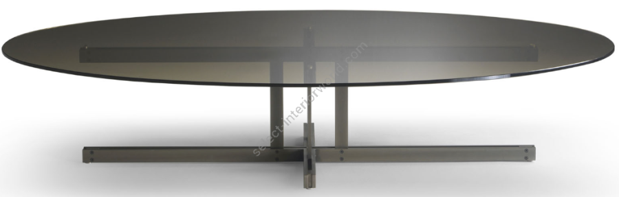 Elegant oval central table in modern style with bronzed metal base and smoked glass top. The apparent simplicity of this element becomes true beauty and hides its great design and manufacturing complexity. GREGORIO is a functional complement that is decisive in characterizing an environment.