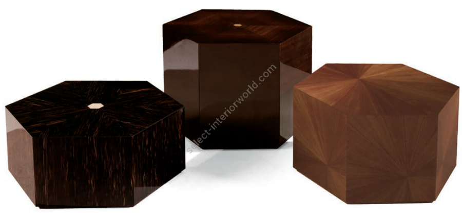 Elegant set of tables that combines three different essences with taste and elegance. Three different colors to create harmonies of light and color. Of this set, the low table T173/S is in palm wood and has a dark and decisive color with light and vertical grain. The medium table is in canaletto walnut, has a lighter color that fades into a radius, the high table is in eucalyptus wood and boasts an intermediate color with dense grain with light contrasts.