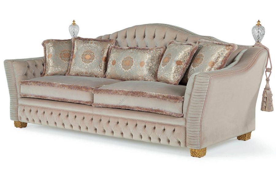 Borromeo is characterized by elegant handmade workmanship and is embellished with decorative cushions and hand-chiseled crystal elements that underline the shape of the backrest. With a solid structure in solid wood, padding in polyurethane of different densities, cushions in goose puma, feet carved and decorated in gold leaf, the Borromeo sofa is available in the 3-seater, 2-seater versions.