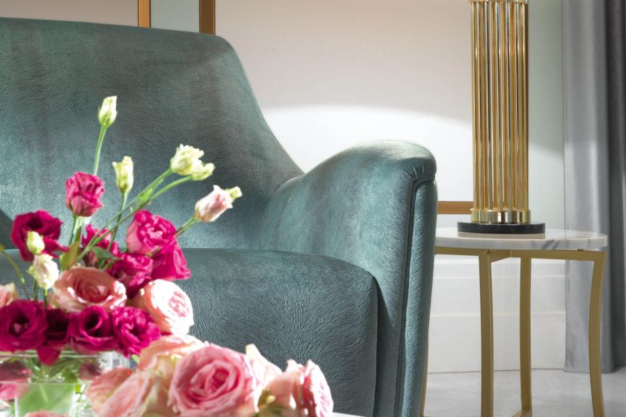 Velvet living room with a simple and sinuous design. Its pleasant design is the result of careful research that resulted in a harmonious union between present and past, tradition and innovation. Its apparent simplicity hides its great design complexity. Its style represents a vision: the art of living through furniture and accessories in which design, style, material, new workmanship and tailoring create new aesthetic codes.